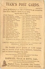 OILETTE, PRINTED IN ENGLAND, listed in 1908/1909 &1911/1912 & 1912/1913 POSTCARD Catalogues, come with various advertisements, opt. in green, on back