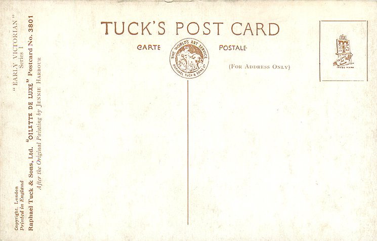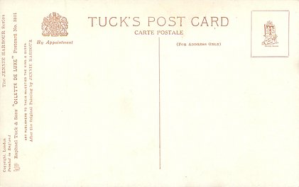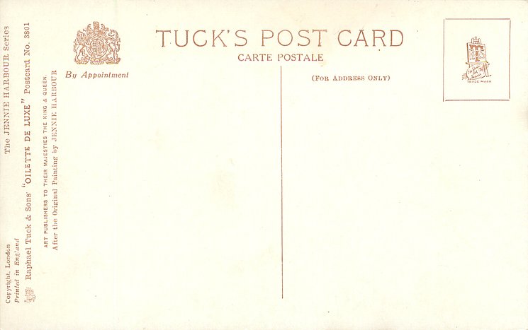 OILETTE DE LUXE, PRINTED IN ENGLAND, COPYRIGHT LONDON, packet 2 types, seen with individual card numbers, comes oilfacsim but not so trade named, comes gold bevelled, 4 backs, listed in 1930 POSTCARD Catalogue 1932 ART SERVICE Catalogue, come with THE JENNIE HARBOUR SERIES title