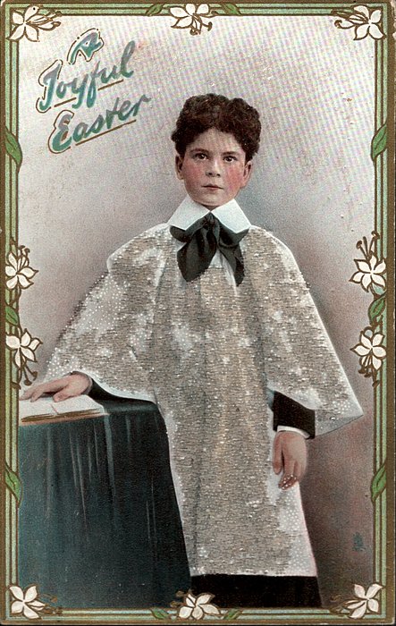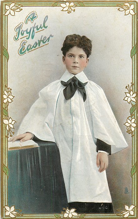 silvered, EASTER post card, PROCESSED IN SAXONY, embossed border around circular insets