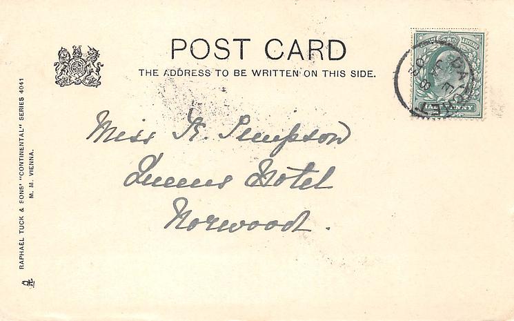 comes opt. in blue "HERE MUTINOUS WATERS HURRY TO THE WAR, AND TROOPS OF WAVES COME ROLLING FROM AFAR" by COWLEY, or CHRISTMAS GREETINGS comes with Tuck advert for PLATE-MARKED postcards in red on back THE NOVELTY FOR1908