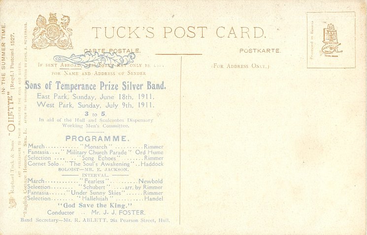 comes use to promote:- SONS OF TEMPERANCE SILVER BAND, 1911 PROGRAMME HULL on back in blue