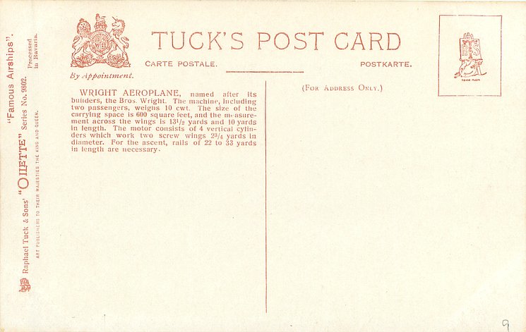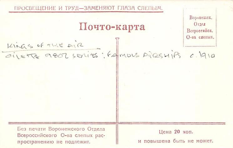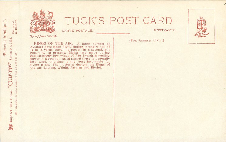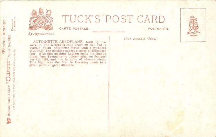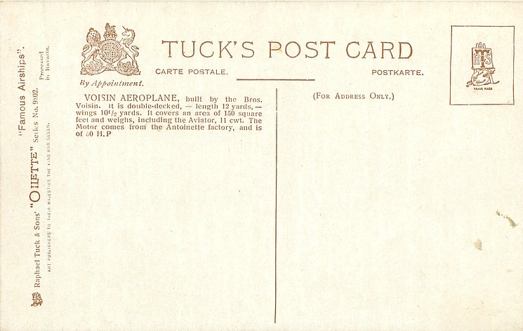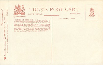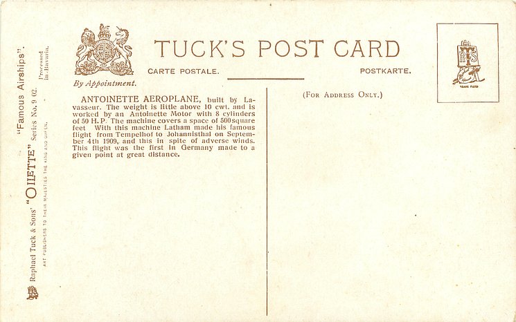 OILETTE, listed in 1911/1912 & 1913/1914 Postcard Catalogues, PROCESSED IN BAVARIA, 2 backs, same image German back 452 OILETTE FLUGMASCHINEN