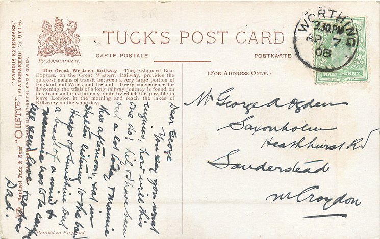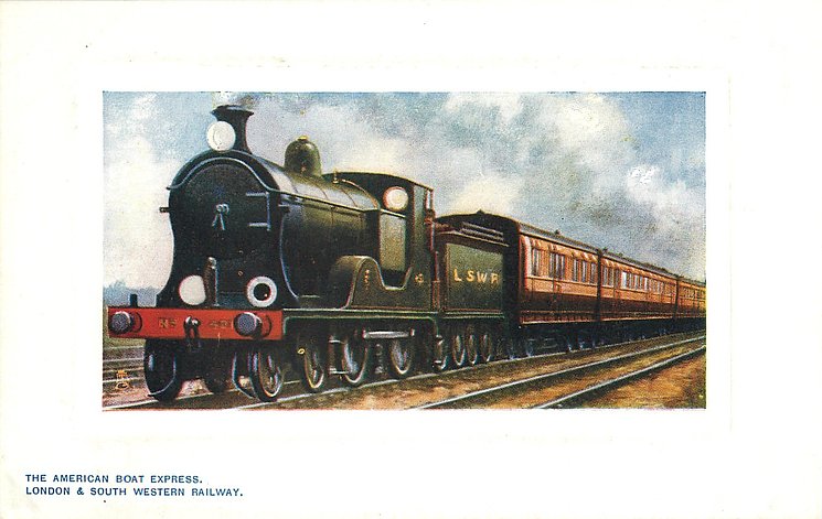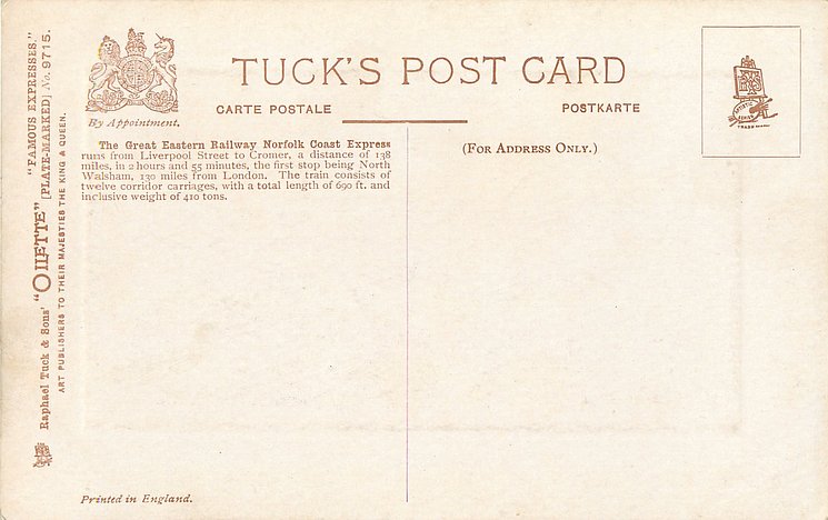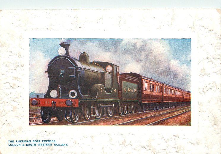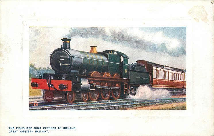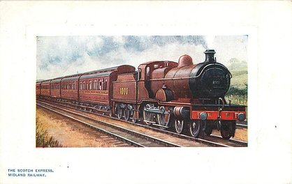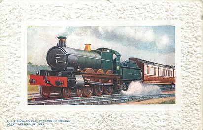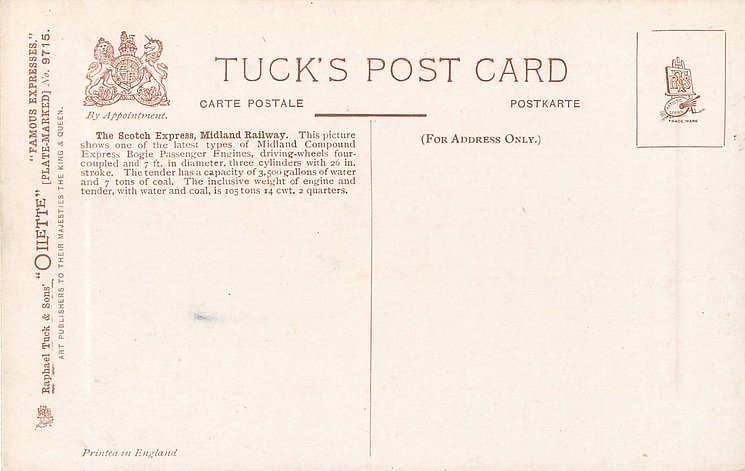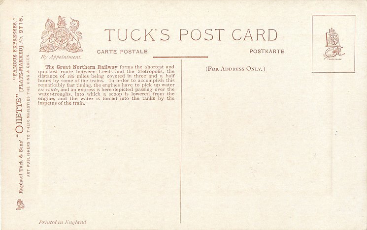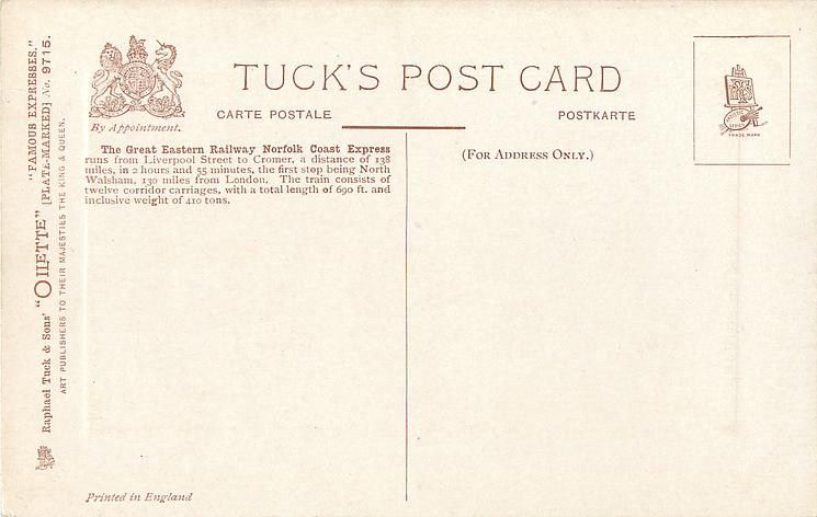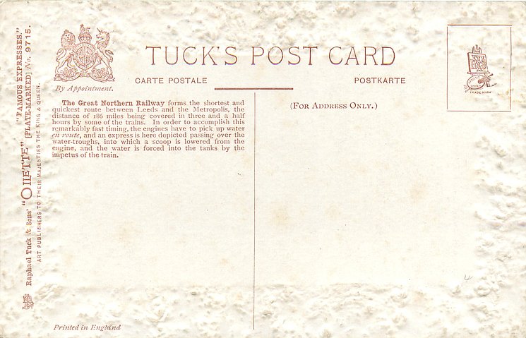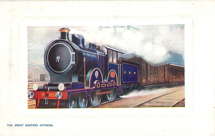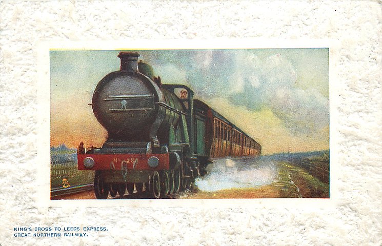 comes with multi-colloured glitter, opt. in gilt A PROSPEROUS NEW YEAR or A HAPPY NEW YEAR (image from Hein De Jong). tuck error - express called flying scotsman.