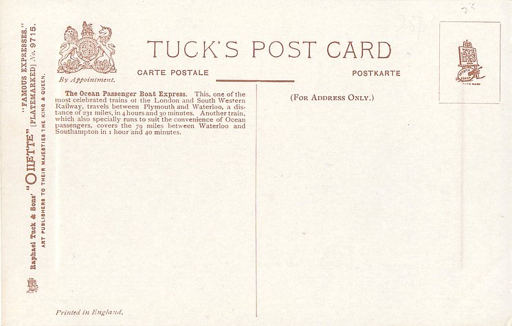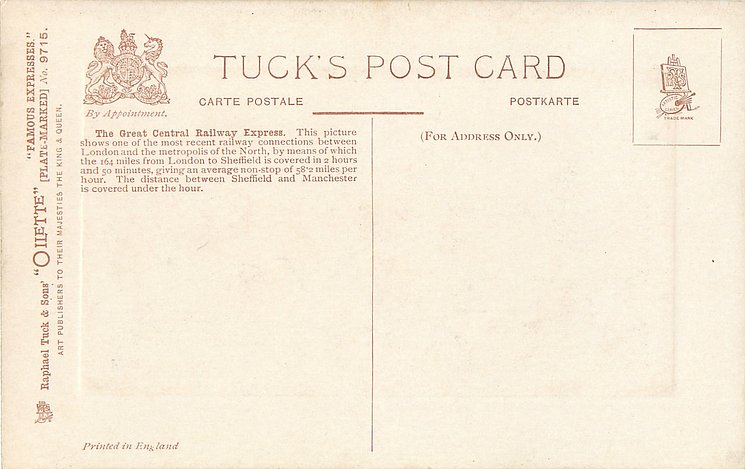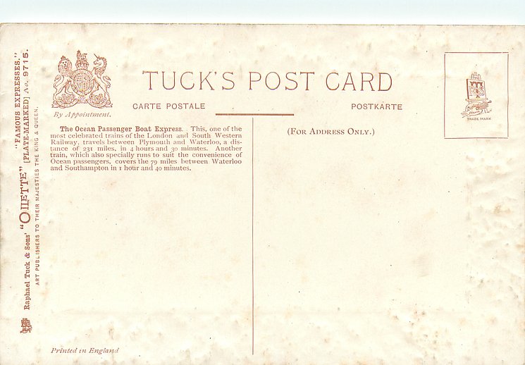 OILETTE, PLATE-MARKED, PRINTED IN ENGLAND, come with embossed margins, much back information, listed in 1908/1909 & 1911/1912 & 1913/1914 Postcard Catalogues