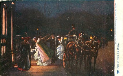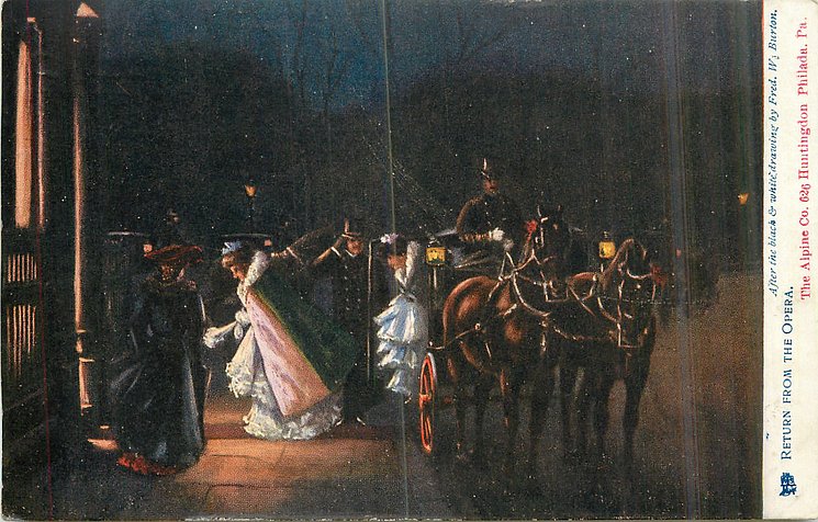 AFTER THE BLACK & WHITE DRAWING BY FRED. BURTON, same image, English back OILETTE 1543 RETURN FROM THE OPERA