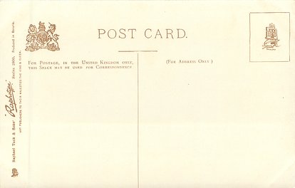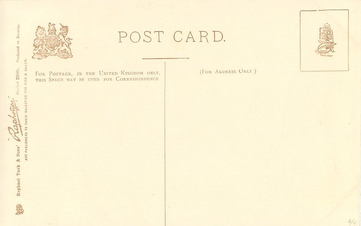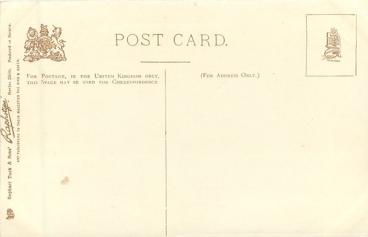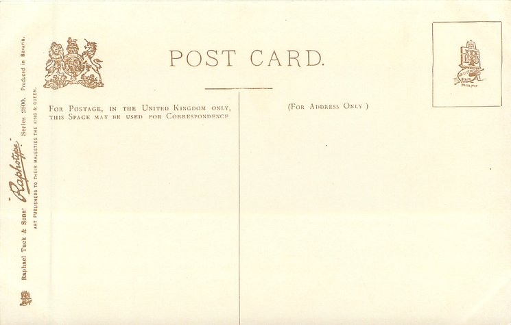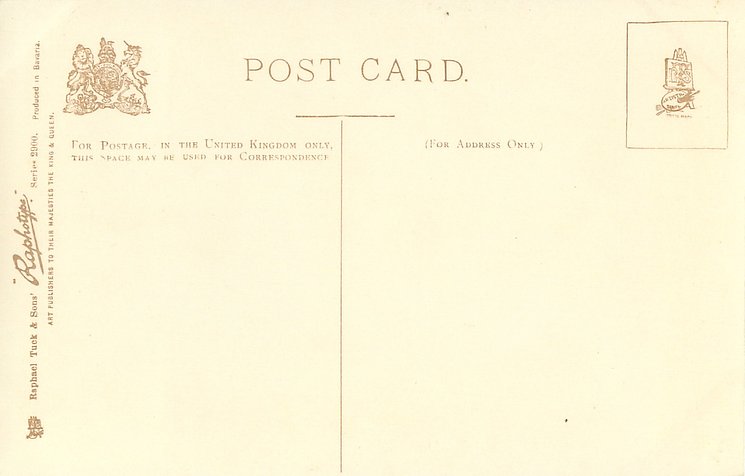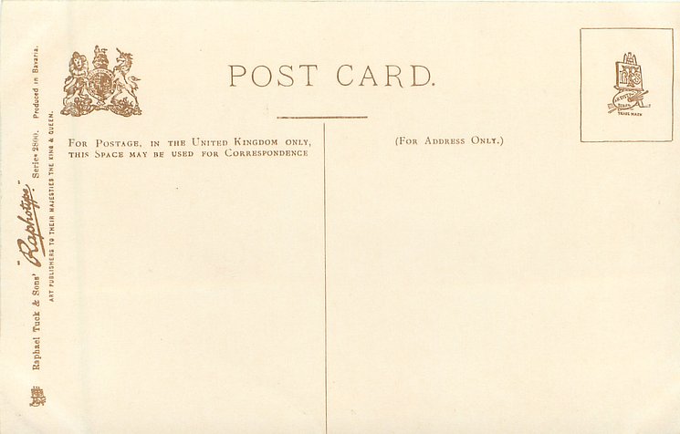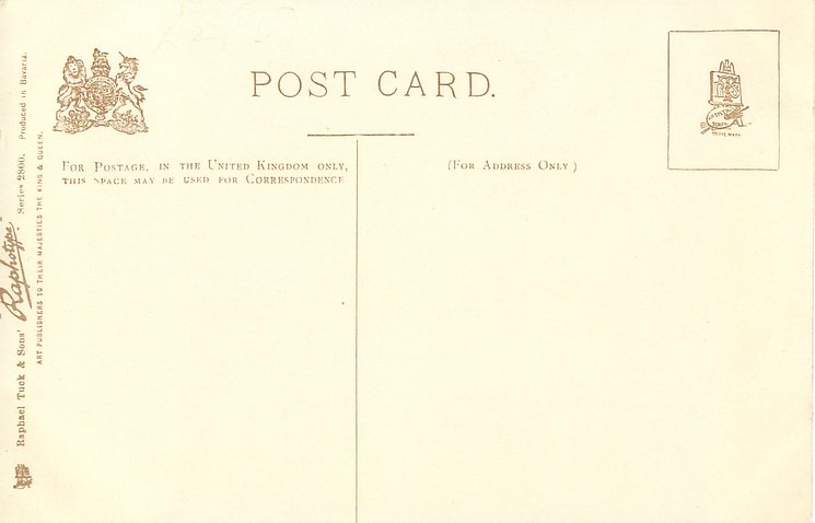 RAPHOTYPE, PRODUCED IN BAVARIA or PHOTOTYPED IN BAVARIA, (in stamp box), come with artists in red or blue,come hand coloured,same images RAPHOTYPE 2800 in sepia, listed in 1904 POSTCARD Catalogue