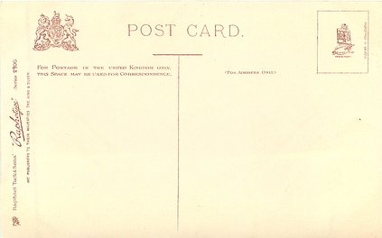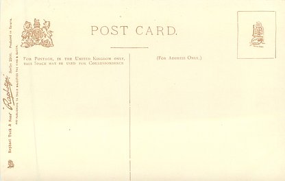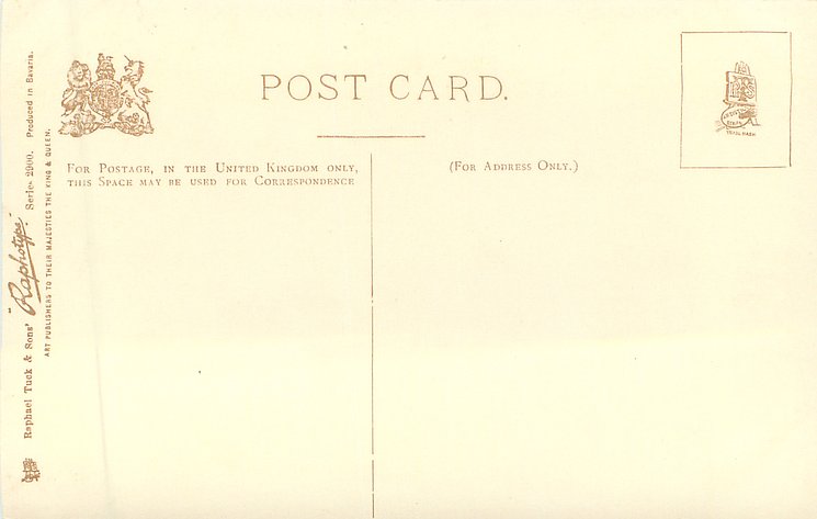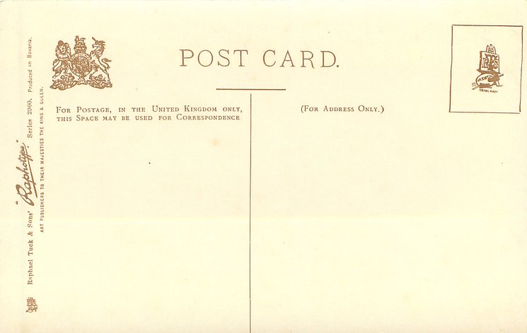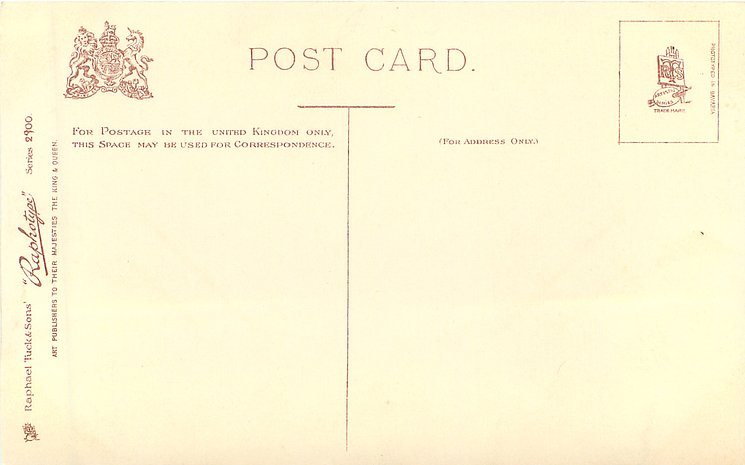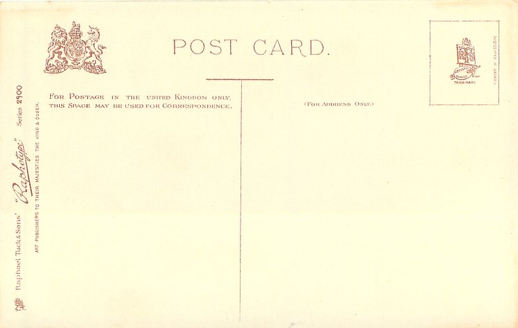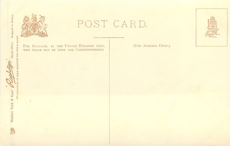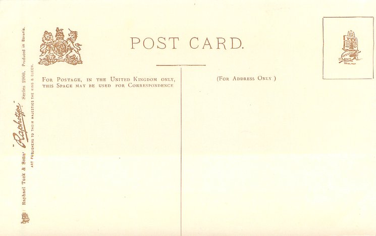 RAPHOTYPE, PRODUCED IN BAVARIA or PHOTOTYPED IN BAVARIA, (in stamp box), come with artists in red or blue,come hand coloured,same images RAPHOTYPE 2800 in sepia, listed in 1904 POSTCARD Catalogue
