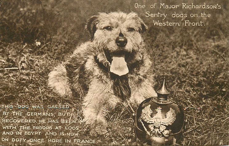 inscription cont'd: THIS DOG WAS GASSED BY THE GERMANS, BUT RECOVERED. HE HAS BEEN WITH THE TROOPS AT LOOS AND IN EHYPT AND IS NOW ON DUTY ONCE MORE IN FRANCE