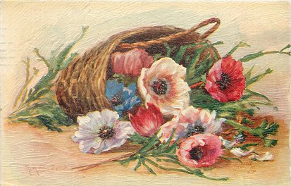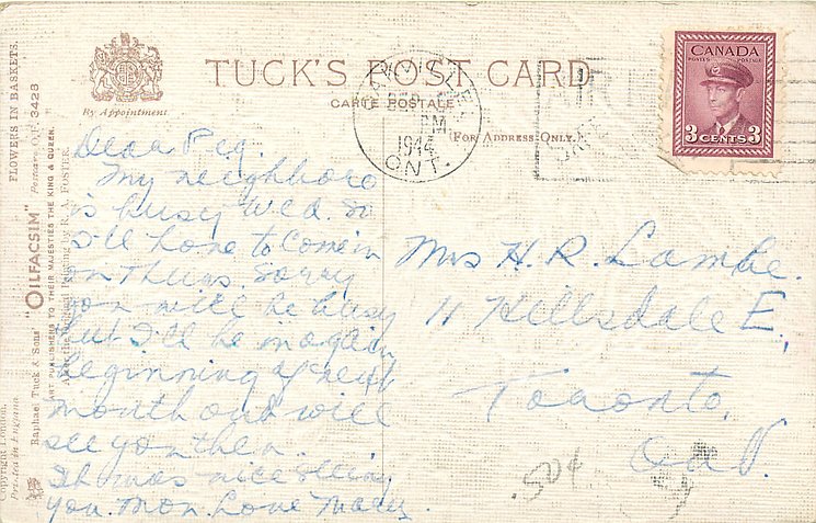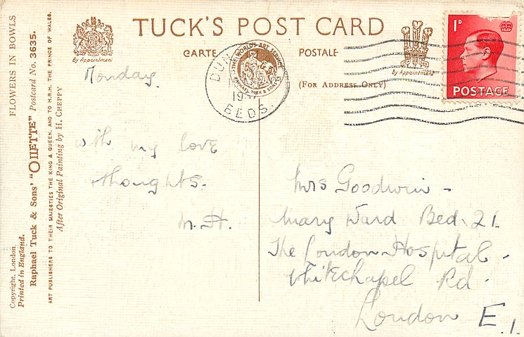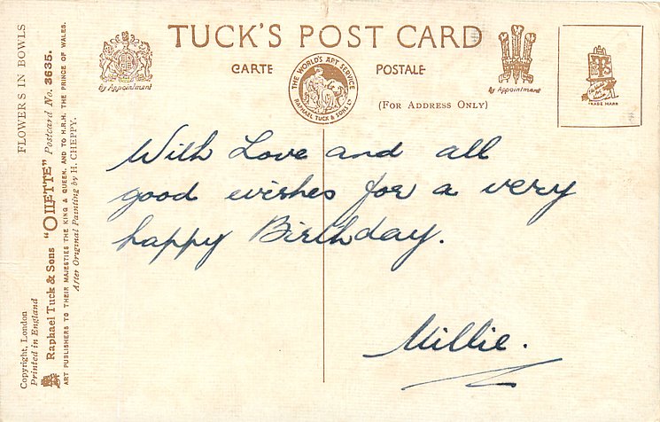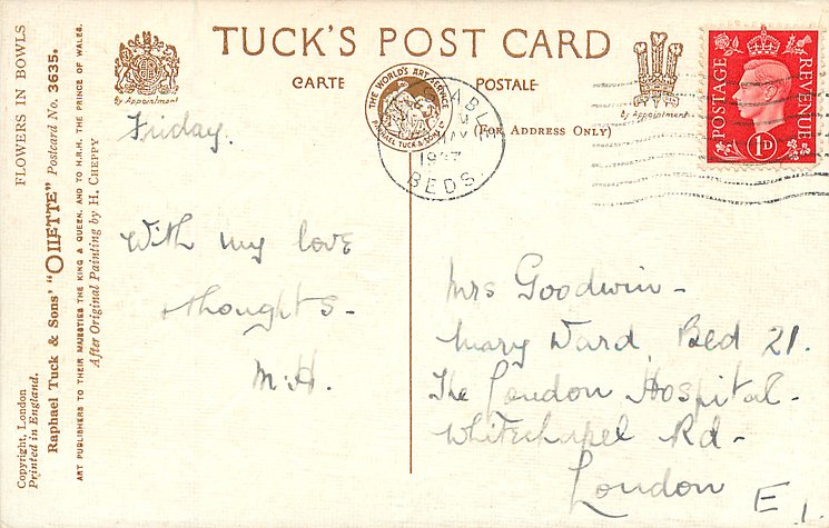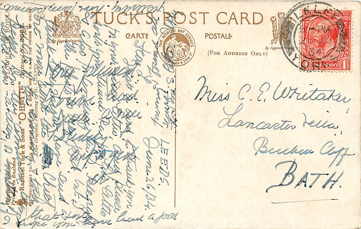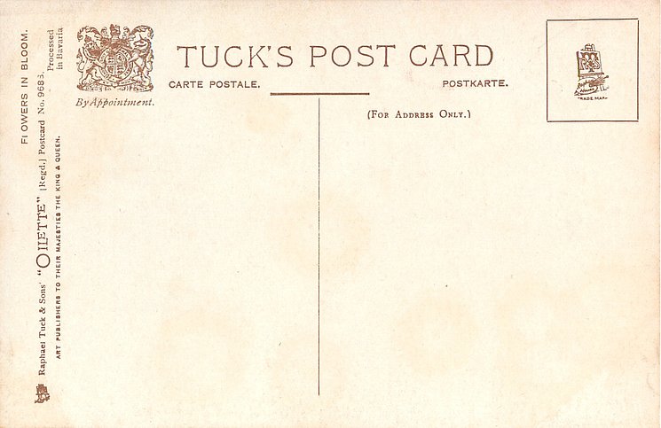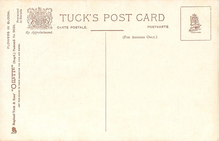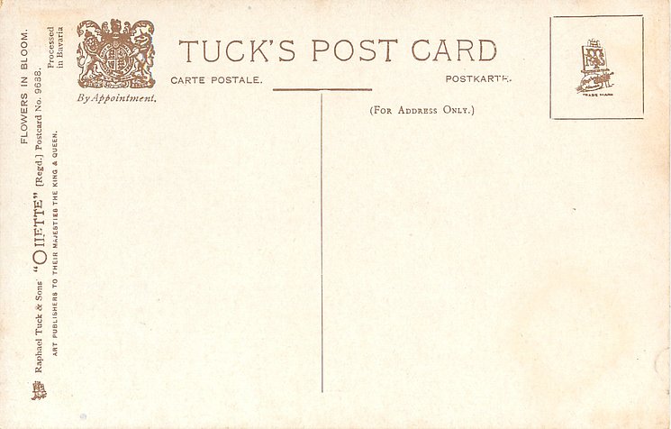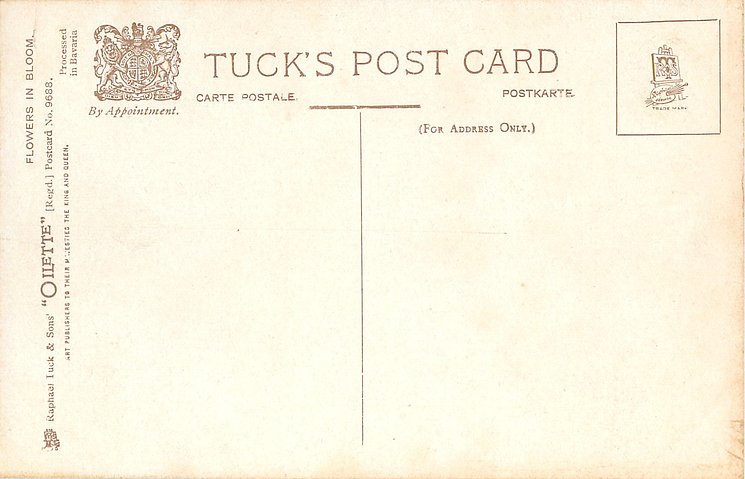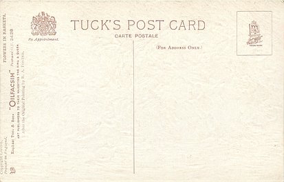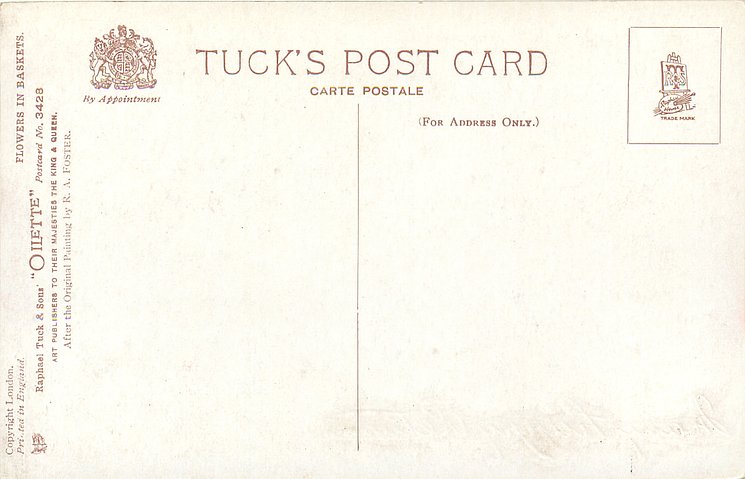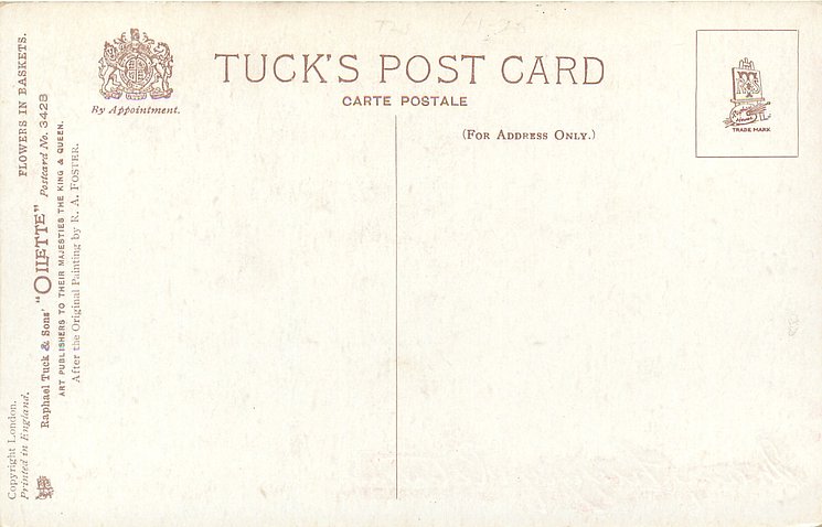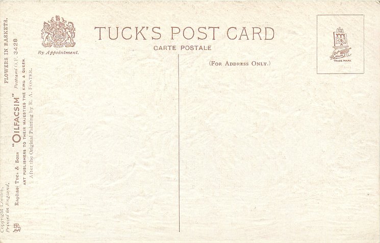 OILETTE, PRINTED IN ENGLAND, COPYRIGHT LONDON, come OILFACSIM with O.F. prefixes, come with variable greetings & verses, AFTER THE ORIGINAL PAINTING BY R.A. FOSTER. listed in 1930 Postcard Catalogue