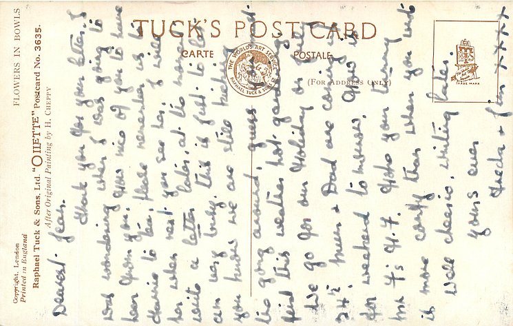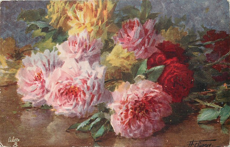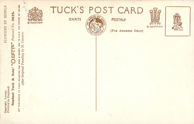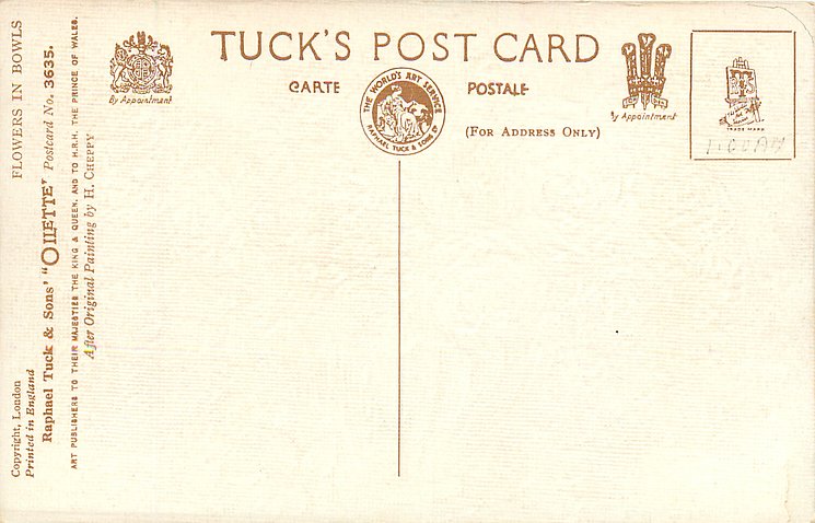 OILETTE, PRINTED IN ENGLAND, COPYRIGHT LONDON, comes oilfacsim but not so trade named, 2 backs, AFTER ORIGINAL PAINTING BY H. CHEPPY, listed in 1930 Postcard Catalogue