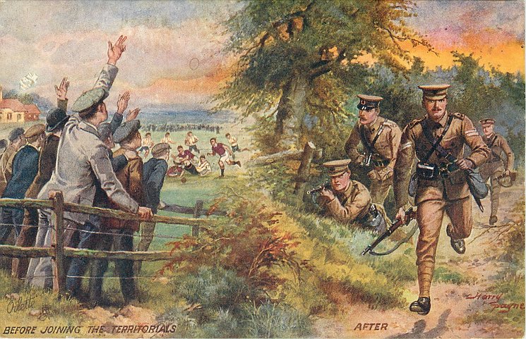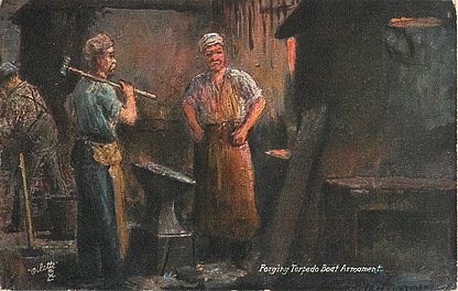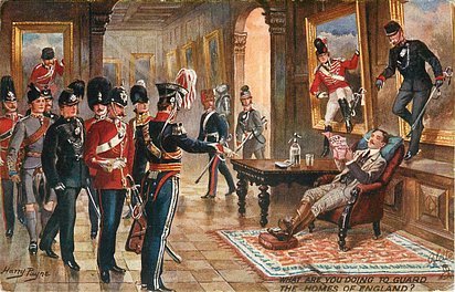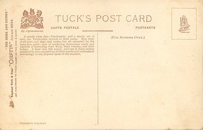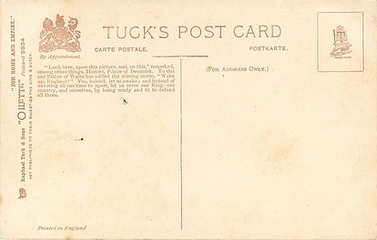 OILETTE, PRINTED IN ENGLAND, listed in 1911/1912 Postcard Catalogue, note: monogram similar (lacks J?) to G.H. Jalland, however genre dissimilar to Jalland's well known, distinctive fox-hunting scenes -- originally noted as Jalland by Smith