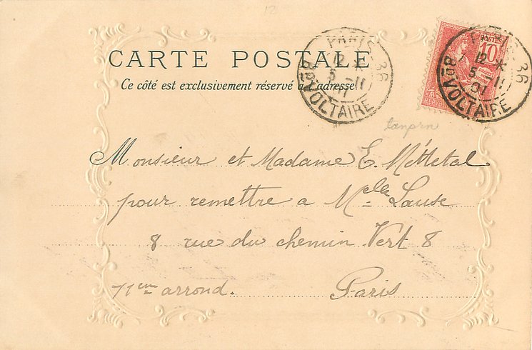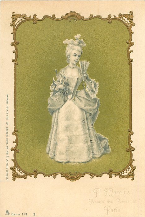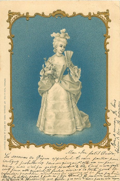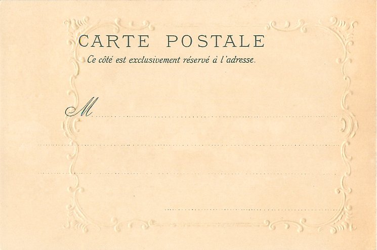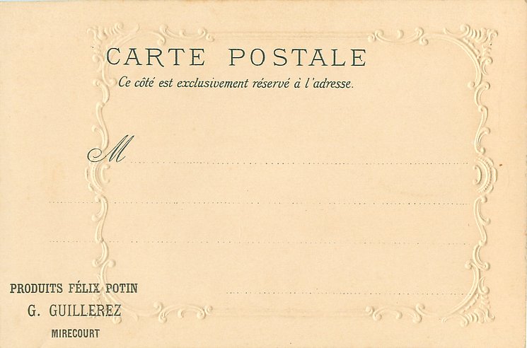 u/b, UN MOT A LA POSTE, (DEPOSE), gilt embossed frames, come with advert. in black on back PRODUITS FELIX POTIN G. GUILLEREZ MIRECOURT, or NOUVELLES GALLERIES MATHIAUX FRERES 8 & 10 RUE D'ALLIER MOULINS (ALLIER) or on front F. MARQUIS, PASSAGE DES PANORAMAS, PARIS