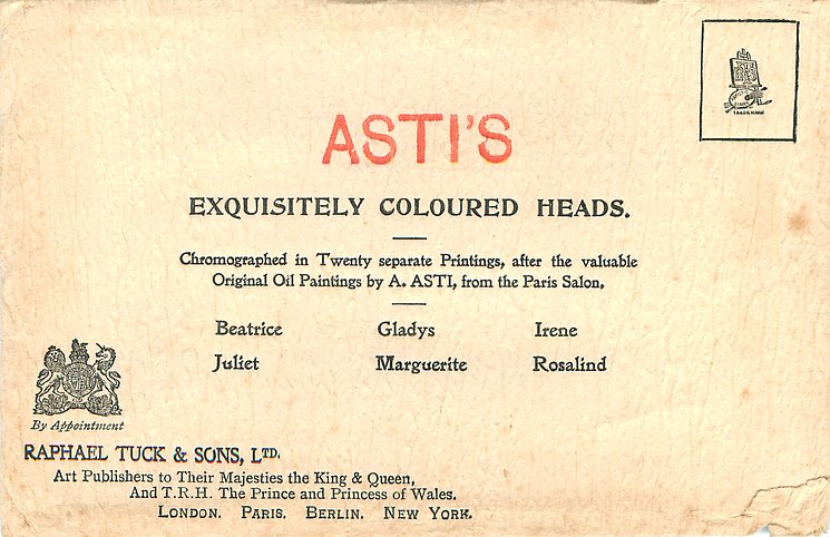 CHROMOGRAPHED IN BERLIN, AFTER THE ORIGINAL PAINTING BY A. ASTI (PARIS SALON)., these images were used widely by Tuck, see "artist"
