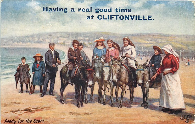 comes opt. in blue HAVING A REAL GOOD TIME AT SKEGNESS, JOLLY TIMES AT WEYMOUTH, JOLLY TIMES AT LOWESTOFT, ON THE SANDS AT ST. LEONARDS-ON-SEA, ON THE SANDS AT BEXHILL-ON-SEA, THE SANDS AT VENTNOR ARE REAL JOLLY, JOLLY TIMES AT YARMOUTH, JUST A LINE FROM WEYMOUTH, HAVING A REAL GOOD TIME AT BLACKPOOL, PAIGNTON - YOU CAN DO AS YOU LIKE DOWN HERE, WE ARE HAVING A JOLLY TIME AT SWANAGE, HAVING A REAL GOOD TIME AT SALTBURN-BY-THE-SEA, JOLLY TIMES AT MORECAMBE. better images needed for Paignton card.