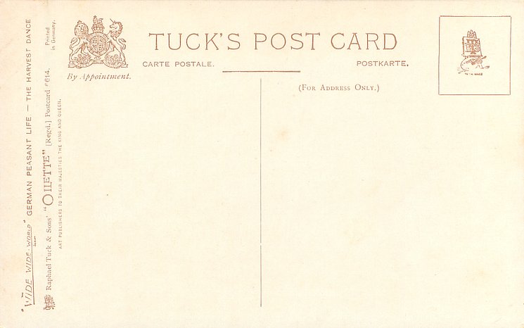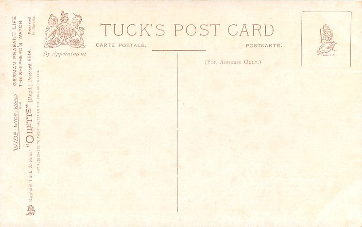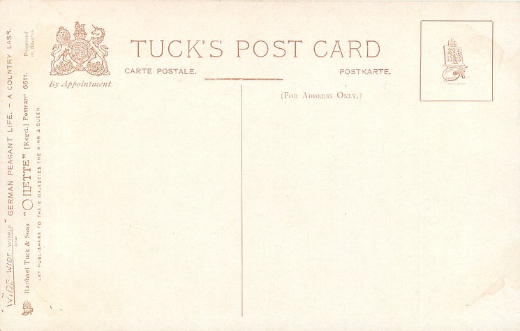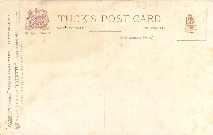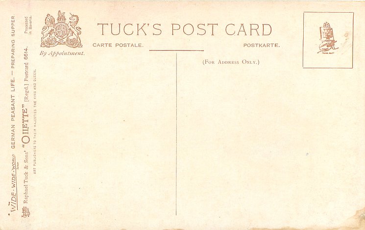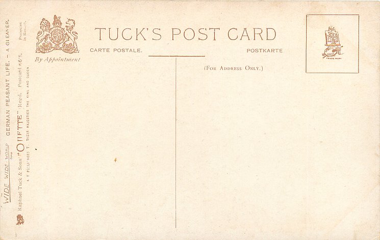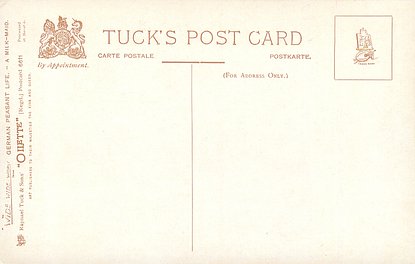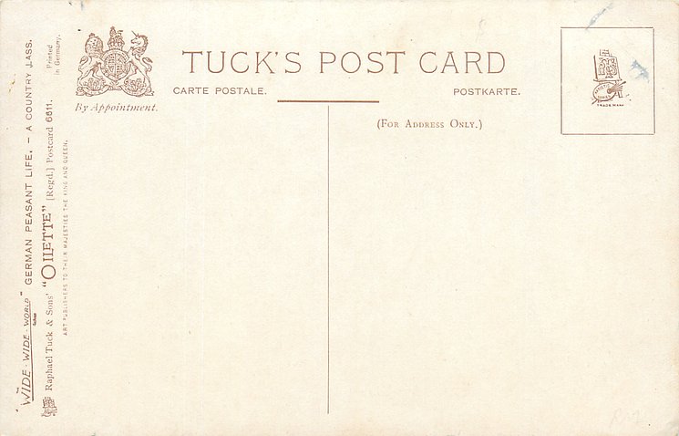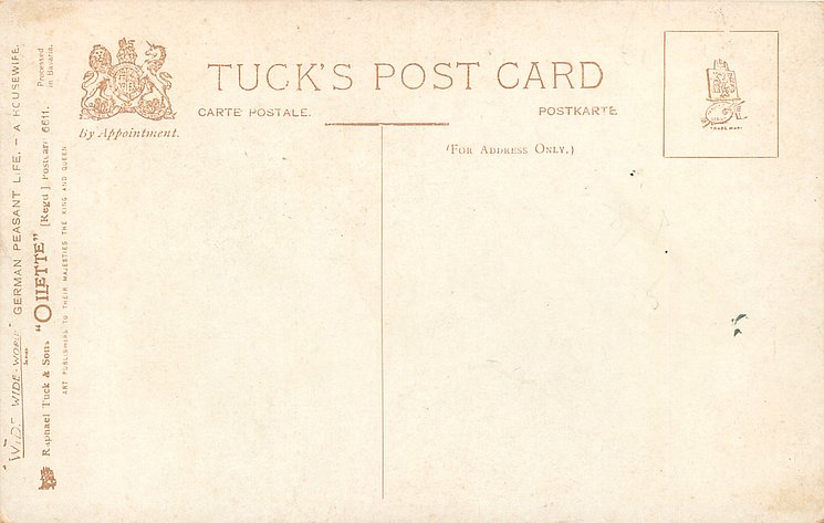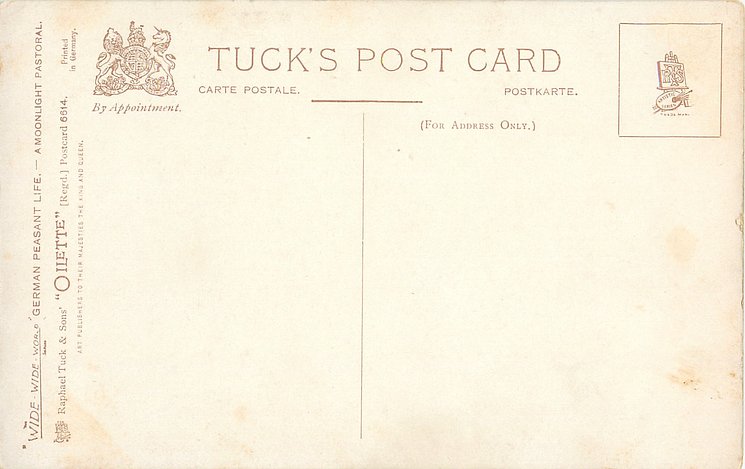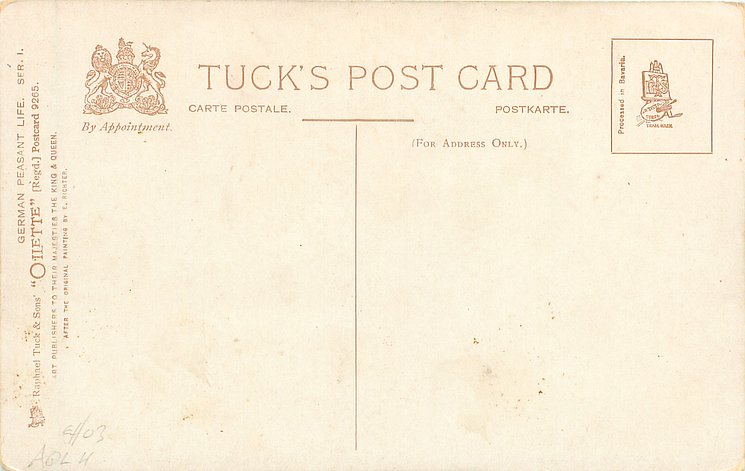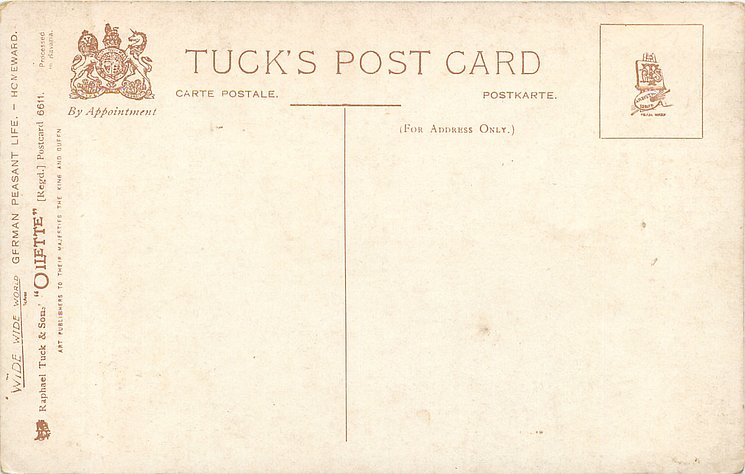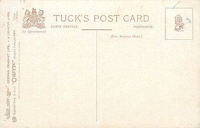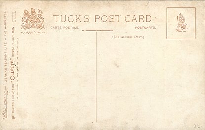 OILETTE, PROCESSED IN BAVARIA (in stamp box), listed in 1908/1909 & 1913/1914 Postcard Catalogue, some images German backs LANDARBEITER 237, FRENCH SERIE 869 P, listed in TUCK'S TRAVELOGUES (USA?1905)