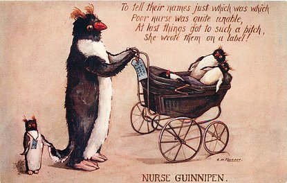 comes opt. in red A HAPPY CHRISTMAS, comes verse: TO TELL THEIR NAMES JUST WHICH WAS WHICH POOR NURSE WAS QUITE UNABLE, AT LAST THINGS GOT TO SUCH A PITCH, SHE WROTE THEM ON A LABEL!