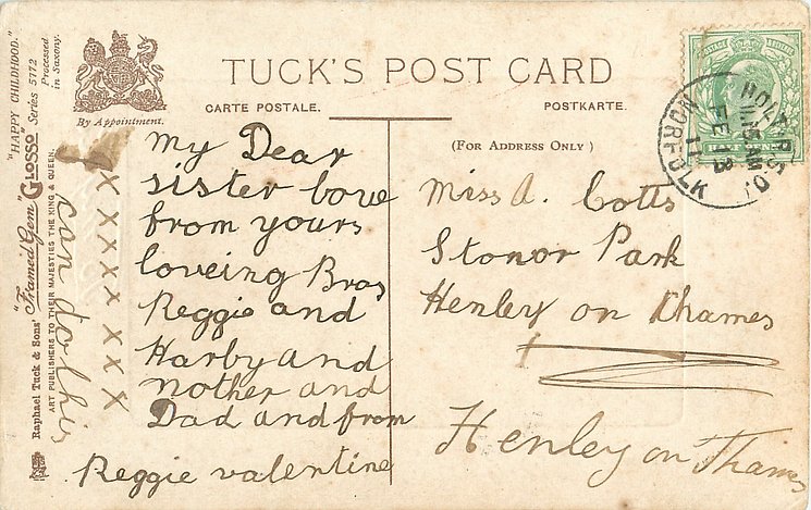 comes opt. in black:-MUMMY DEAR IT'S NICE DOWN HERE AND WE HAVE FUN GALORE, HERE'S LOTS OF LOVE TO DADDY AND YOU MAY WE SOON BE TOGETHER ONCE MORE! (for sale to WW II evacuees)