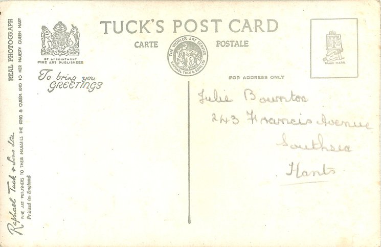 REAL PHOTOGRAPH, PRINTED IN ENGLAND, TO BRING YOU GREETINGS or GREETINGS TO YOU on back
