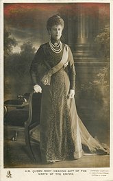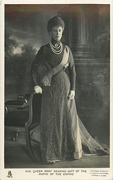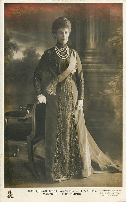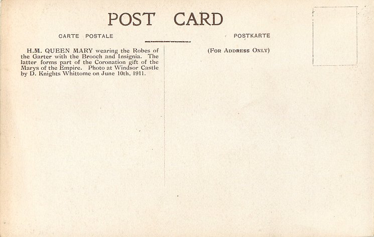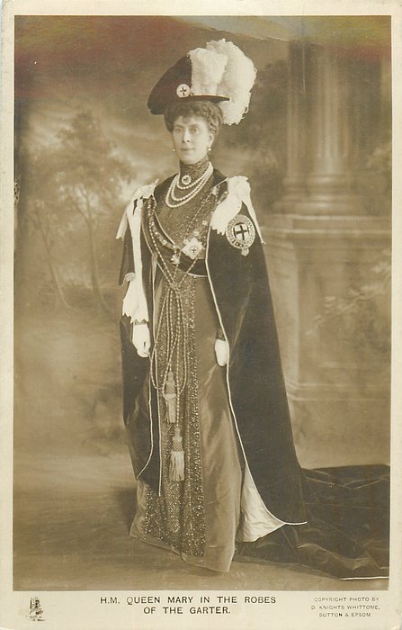 back:- H.M. QUEEN MARY WEARING THE ROBES OF THE GARTER WITH THE BROOCH AND INSIGNIA. THE LATTER FORMS PART OF THE CORONATION GIFT OF THE MARYS OF THE EMPIRE. PHOTO AT WINDSOR CASTLE BY D. KNIGHTS WHITTOME ON JUNE 10TH 1911
