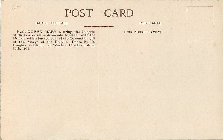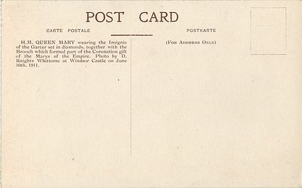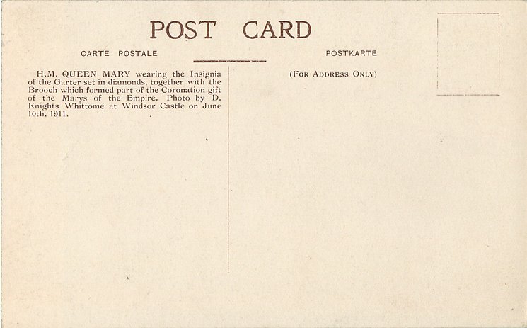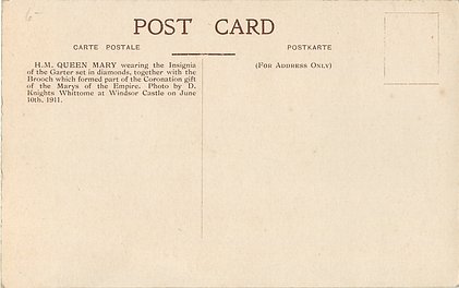 back:- H.M. QUEEN MARY WEARING THE INSIGNIA OF THE GARTER SET IN DIAMONDS, TOGETHER WITH THE BROOCH WHICH//JUNE 10TH, 1911.