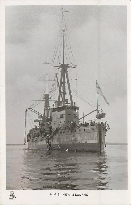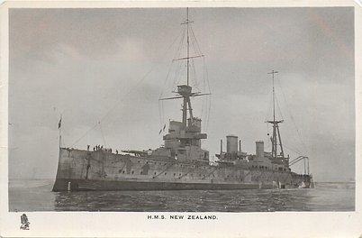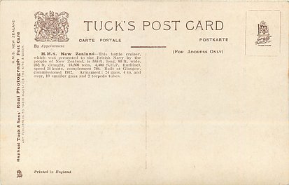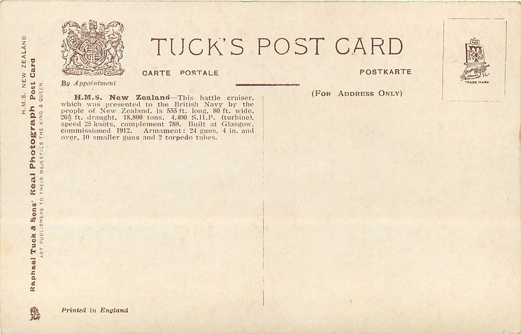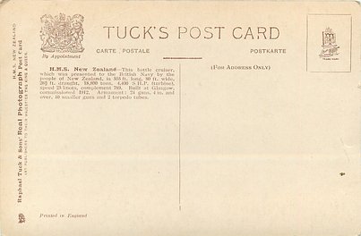 back:- H.M.S. NEW ZEALAND - THIS BATTLE CRUISER, WHICH WAS PRESENTED TO THE BRITISH NAVY BY THE PEOPLE OF NEW ZEALAND, IS 555 FT. LONG, 80 FT. WIDE, 26 1/2 FT. DRAUGHT, 18,800 TONS. 4,400 S.H.P. (TURBINE), SPEED 25 KNOTS, COMPLEMENT 789. BUILT AT GLASGOW, COMMISSIONED 1912. ARMAMENT: 24 GUNS, 4 IN. AND OVER, 10 SMALLER GUNS AND 2 TORPEDO TUBES.