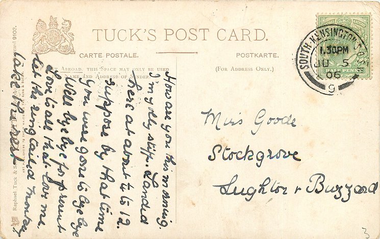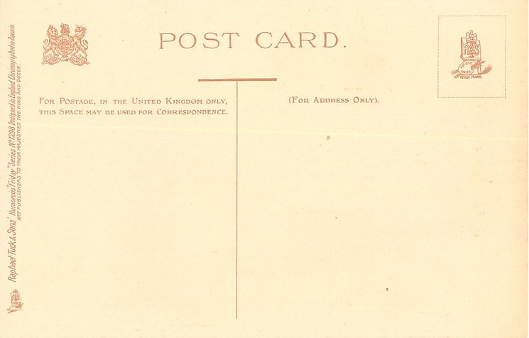 DESIGNED IN ENGLAND, CHROMOGRAPHED IN BERLIN, listed as WRITE AWAY in 1904 & 1908/1909 & 1911/1912 Postcard Catalogues, same images, French backs & card titles SERIE 431, Friday's head & neck image used for greeting WE'RE ALL COME TO GREET YOU, similar images used for non-postcard Greetings