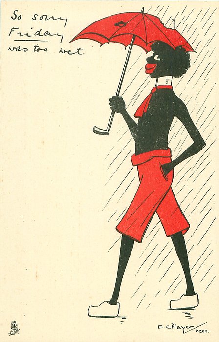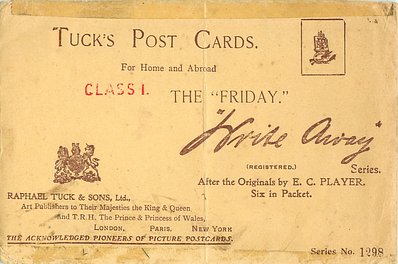 title of English backed card AFRAID FRIDAY IS NOT PARTICULARLY SUITED same basic image comes as Tuck Ephemera greeting card, artist