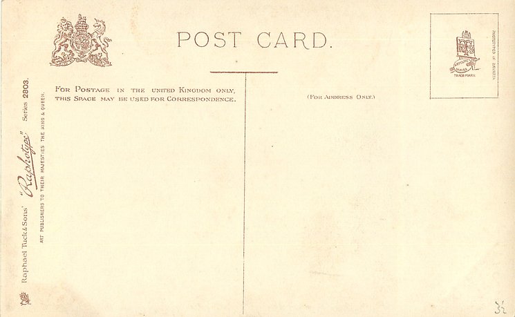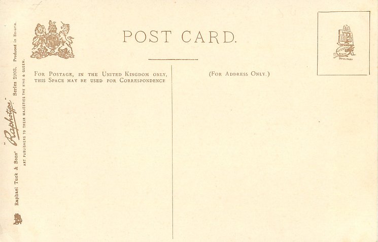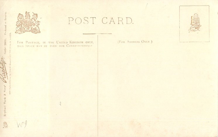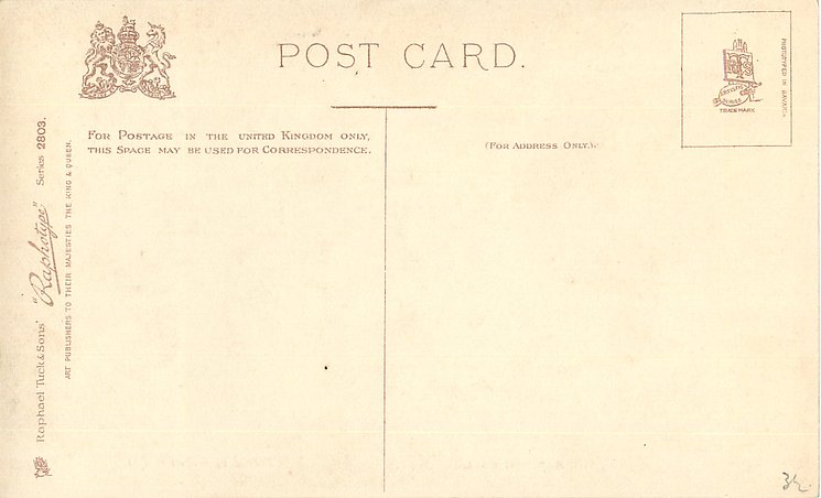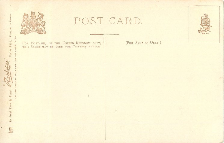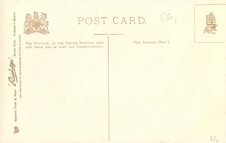 RAPHOTYPE, PRODUCED IN BAVARIA or PHOTOYPED IN BAVARIA (in stamp box), same set in green/black 2903, PAINTED BY J. CHARLTON or GILBERT WRIGHT., listed in 1904 POSTCARD Catalogue