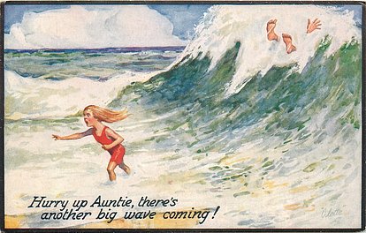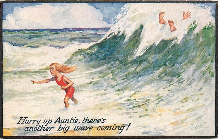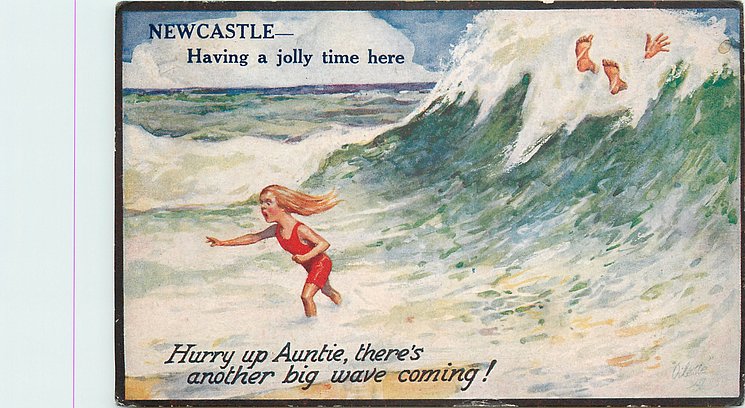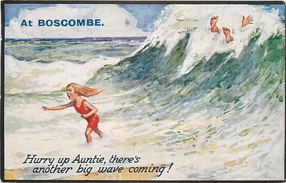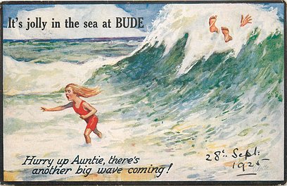 comes opt. in blue AT BOSCOMBE, NEWCASTLE - HAVING A JOLLY TIME HERE, in black IT'S JOLLY IN THE SEA AT BUDE