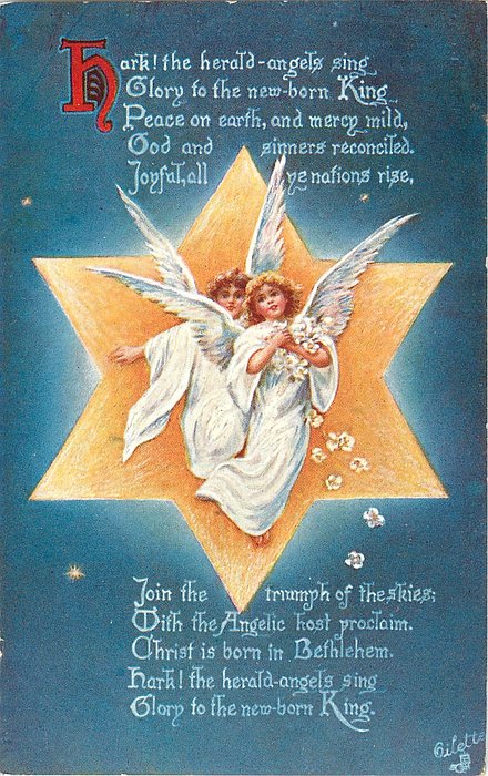 verse:- HARK! THE HERALD ANGELS SING GLORY TO THE NEW-BORN KING, PEACE ON EARTH & MERCY MILD, GOD AND SINNERS RECONCILED.