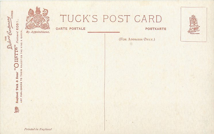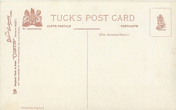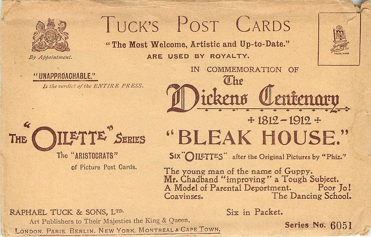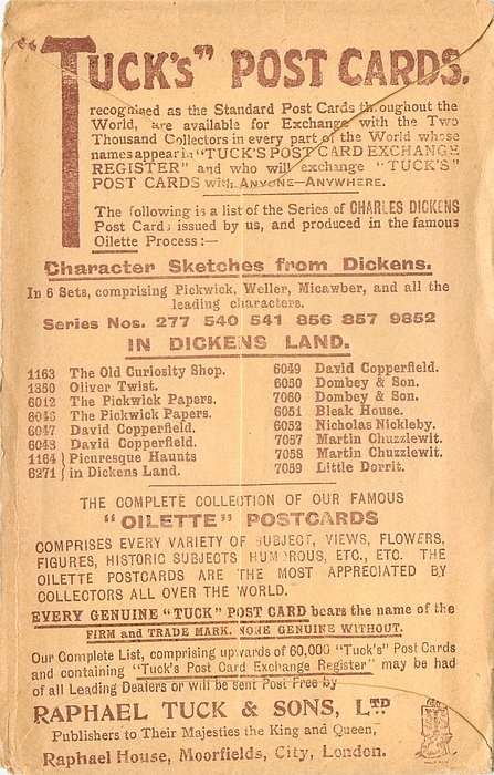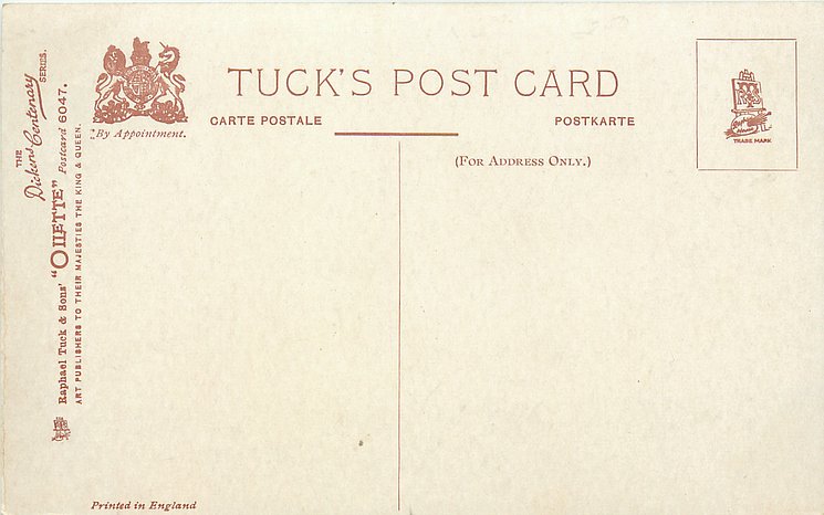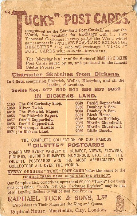 OILETTE, PRINTED IN ENGLAND with THE DICKENS CENTENARY or DESIGNED AND PRINTED IN ENGLAND, listed in 1904 & 1911/1912 & 1913/1914 POSTCARD Catalogues, listed in TUCK'S TRAVELOGUES (USA?1905)