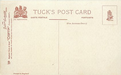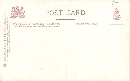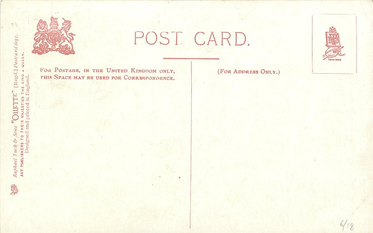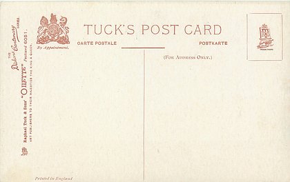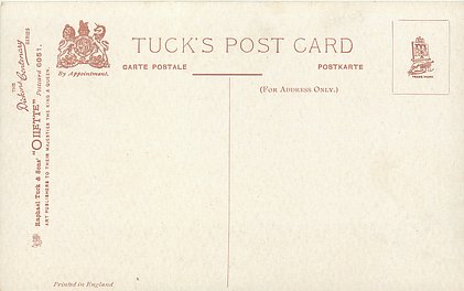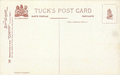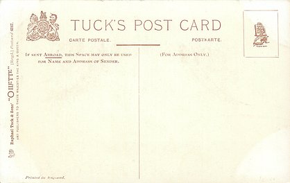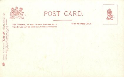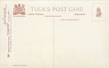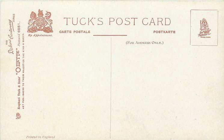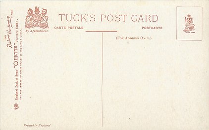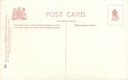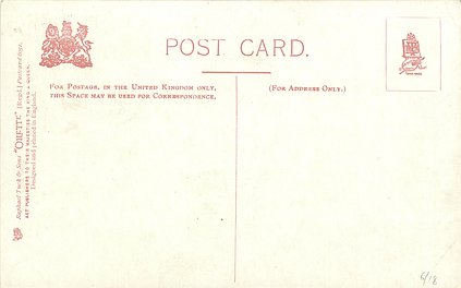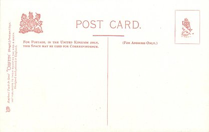 OILETTE or ART (u/b), 5 backs, u/b or d/b, PRINTED IN ENGLAND or not, come with & w/o white border for inscriptions, listed in 1904 & 1908/1909 & 1911/1912 Postcard Catalogues. 6 Cards in set cover all had white border with title.