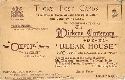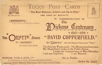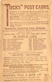 OILETTE, PRINTED IN ENGLAND, listed in 1904 & 1911/1912 & 1913/1914 Postcard Catalogues, with THE DICKENS CENTENARY SERIES (back) or DESIGNED AND PRINTED IN ENGLAND with OILETTE front in design, AFTER THE PICTURE BY "PHIZ.", with or w/o OILETTE on front, listed in TUCK'S TRAVELOGUES (USA?1905)