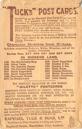 OILETTE, 2 fronts, with or w/o OILETTE, 3 backs, PRINTED IN ENGLAND, listed in 1904 & 1911/1912 & 1913/1914 Postcard Catalogues, with or w/o THE DICKENS CENTENARY or DESIGNED AND PRINTED IN ENGLAND, AFTER THE PICTURE BY "PHIZ.", listed in TUCK'S TRAVELOGUES (USA?1905)