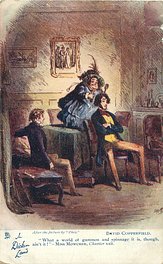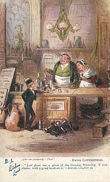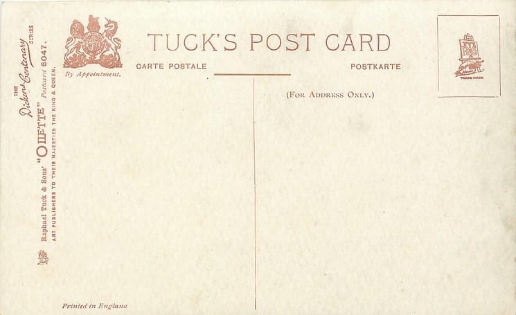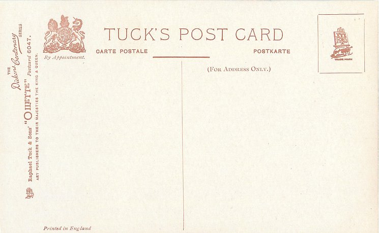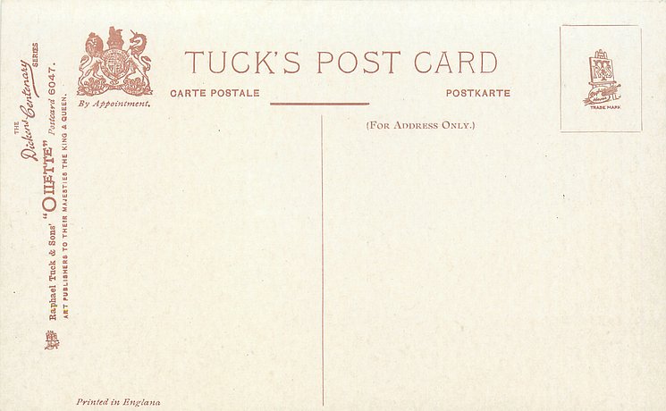 OILETTE, PRINTED IN ENGLAND, listed in 1904 & 1911/1912 & 1913/1914 Postcard Catalogues, with THE DICKENS CENTENARY SERIES (back) or DESIGNED AND PRINTED IN ENGLAND with OILETTE front in design, AFTER THE PICTURE BY "PHIZ.", with or w/o OILETTE on front, listed in TUCK'S TRAVELOGUES (USA?1905)
