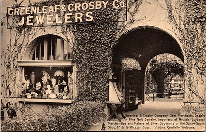 GREENLEAF & CROSBY COMPANY, GEM MERCHANTS, DEALERS IN FINE GOLD JEWELRY, INPORTERS OF ARTISTIC EUROPEAN MERCHANDIS AND MAKERS OF SILVER SOUVENIRS OF THE SUNNY SOUTH. SHOP 17 & 19 ALCAZAR COURT. VISITORS CORDIALLY WELCOM