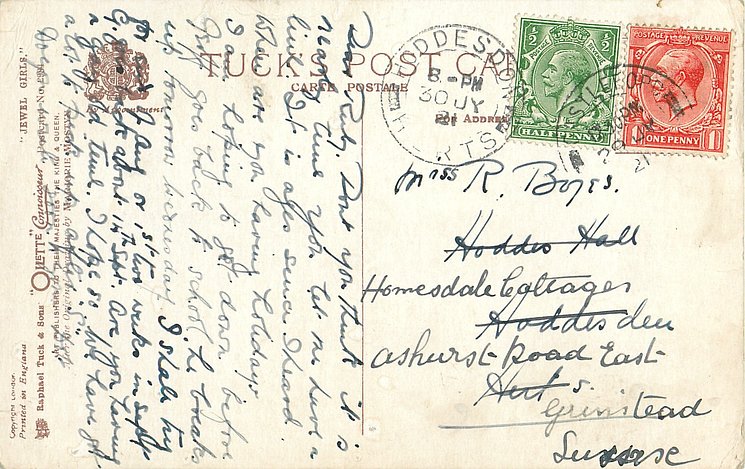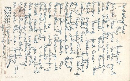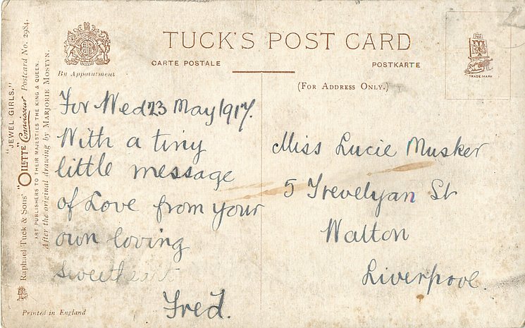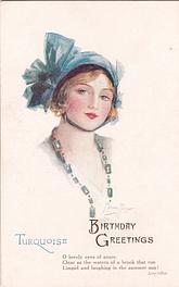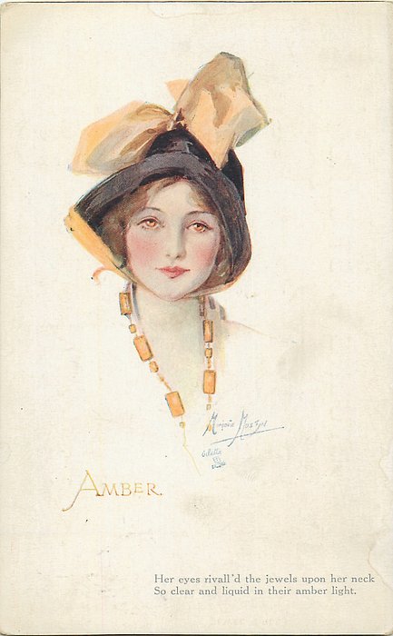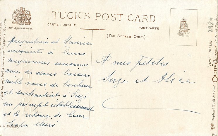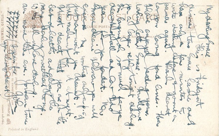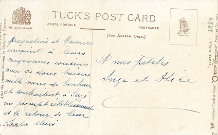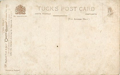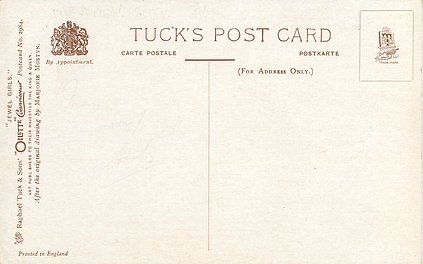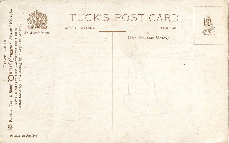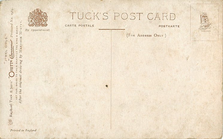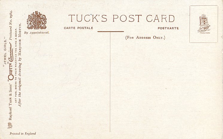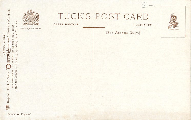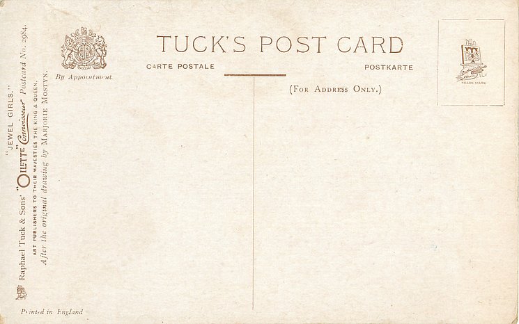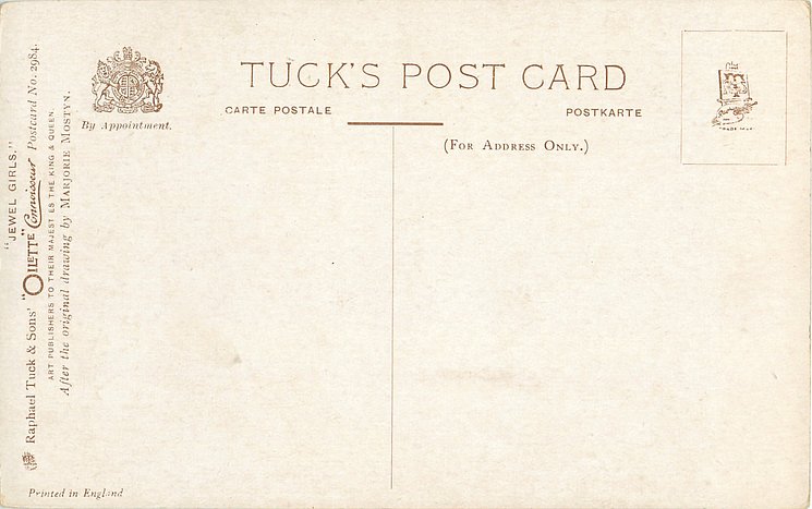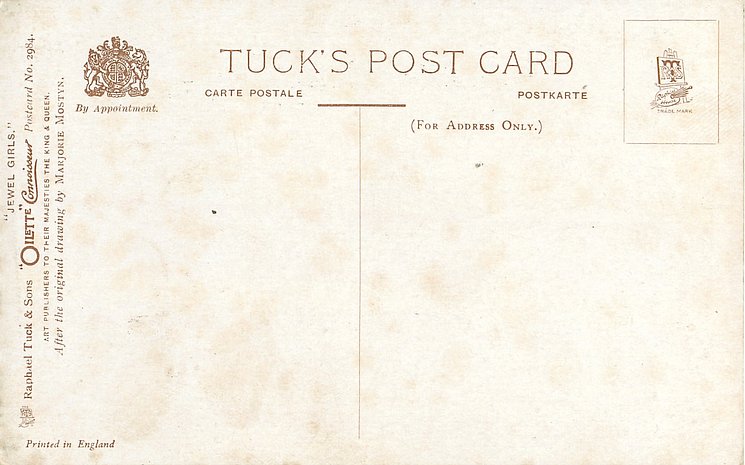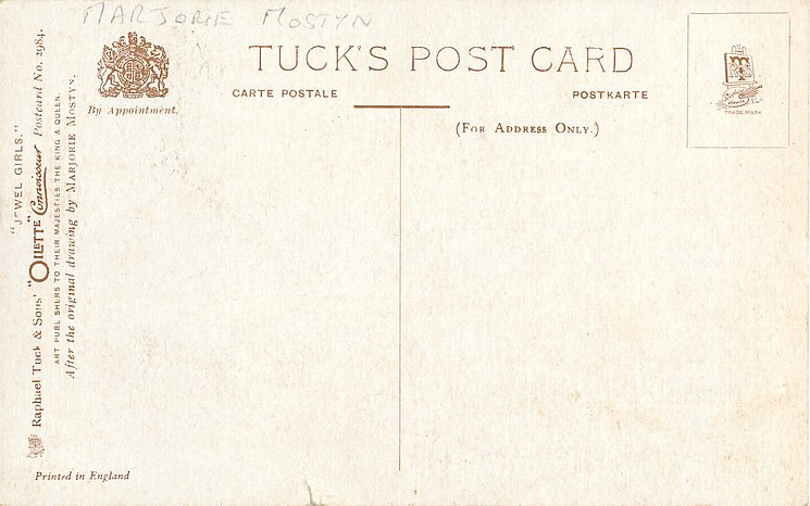 OILETTE CONNOISSEUR, PRINTED IN ENGLAND, with & w/o COPYRIGHT LONDON, quote on bottom of each card, come with greetings printed on back, AFTER THE ORIGINAL DRAWING BY MARJORIE MOSTYN.. listed in1930 POSTCARD Catalogue