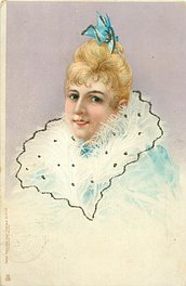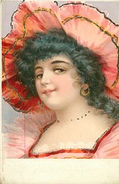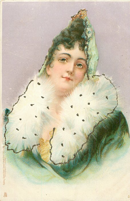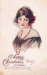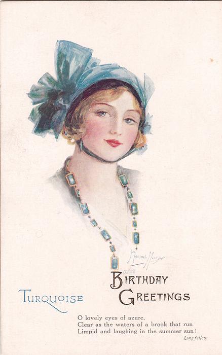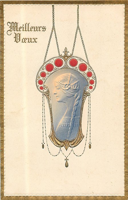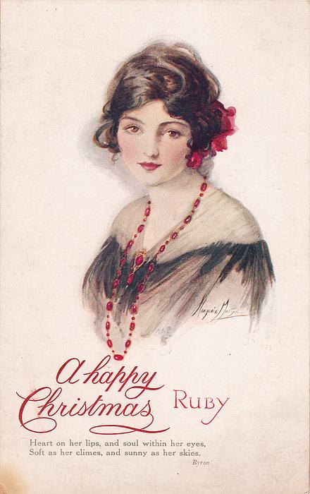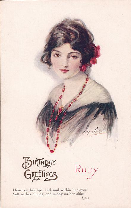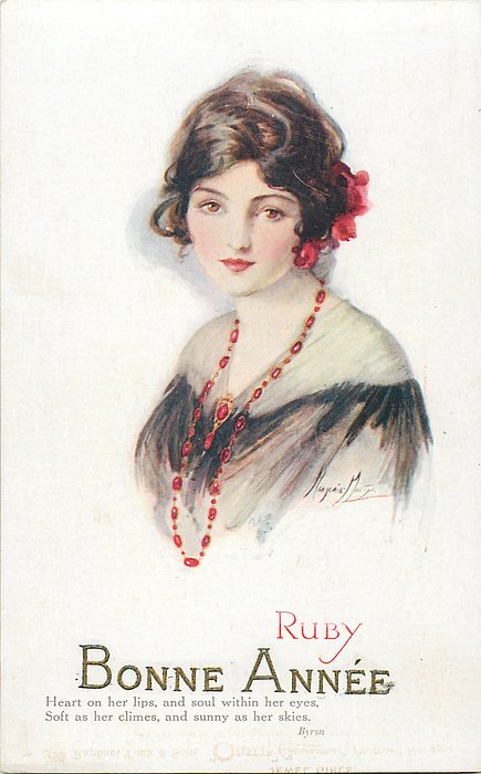 verse:- HEART ON HER LIPS, AND SOUL WITHIN HER EYES, SOFT AS HER CLIMES, AND SUNNY AS HER SKIES. quote BYRON, come opt. in red MANY HAPPY RETURNS or opt. in gilt BONNE ANNEE. image used on Greeting card, WATER COLOUR SERIES
