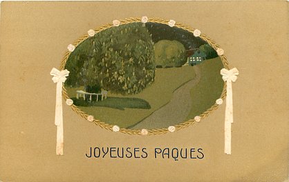 embossed UN MOT A LA POSTE, (DEPOSE), oblong vertical insets above blue JOYEUSES PAQUES surrounded by art nouveau design round all borders