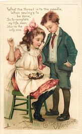 verse:- WHAT THE THREAD IS TO THE NEEDLE, WHEN SEWING'S TO BE DONE, SO TO COMPLETE MY LIFE, DEAR, YOU'RE THE ONLY ONE girl sits sewing