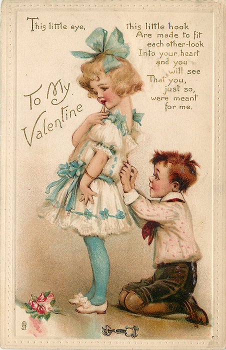 verse:- THIS LITTLE EYE, THIS LITTLE HOOK ARE MADE TO FIT EACH OTHER-LOOK INTO YOUR HEART AND YOU WILL SEE THAT YOU, JUST SO, WERE MEANT FOR ME