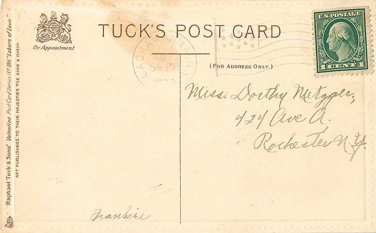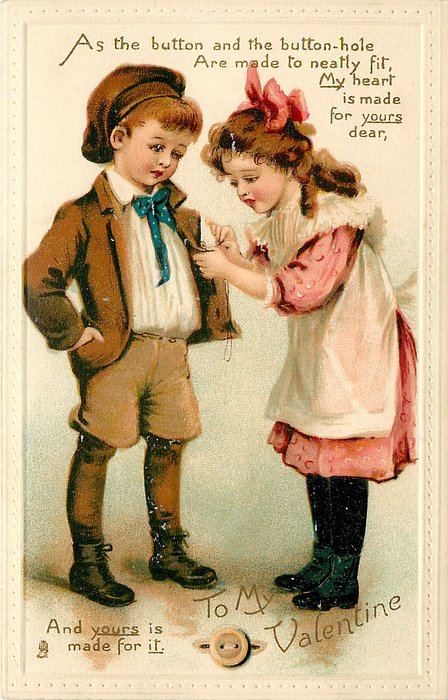 verse:- AS THE BUTTON AND THE BUTTON-HOLE ARE MADE TO NEATLY FIT, MY HEART IS MADE FOR YOURS DEAR, AND YOURS IS MADE FOR IT