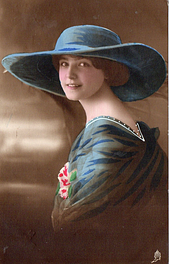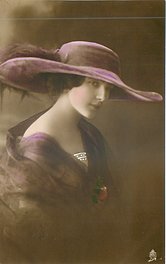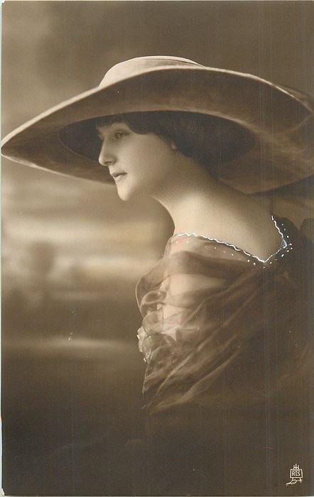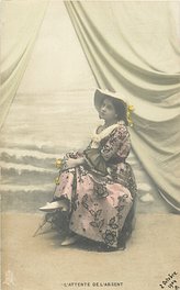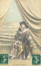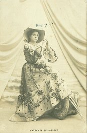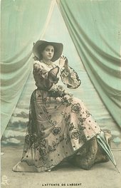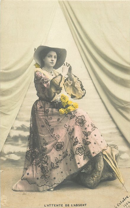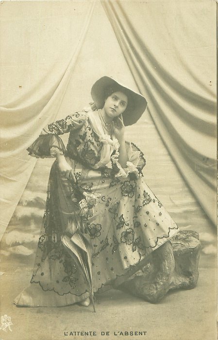 photographic, come in several pastel shades, UN MOT A LA POSTE, (DEPOSE) girl posed in front of split curtains, elaborate dress