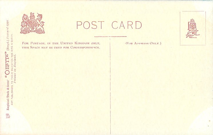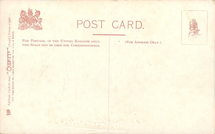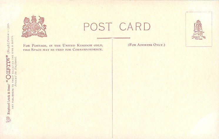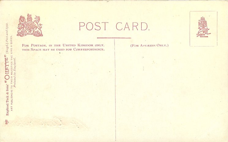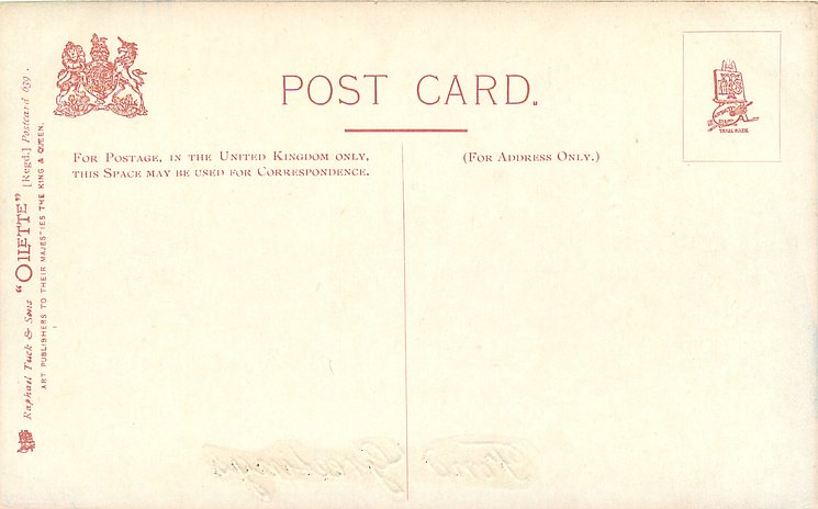 OILETTE, PRINTED IN ENGLAND come with gilt opt. A LOVE TOKEN, listed in 1904 & 1911/1912 POSTCARD Catalogues
