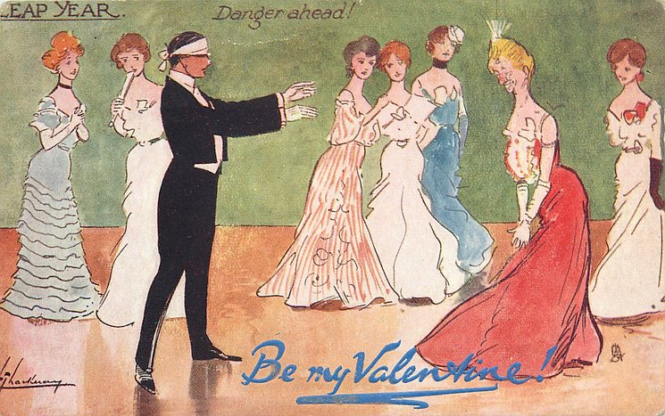 blind-mans buff, he approaches unnattractive lady, six pretty gils watch in horror, ABE MY VALENTINE