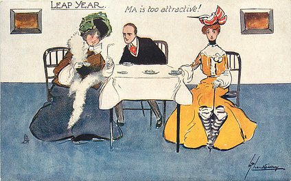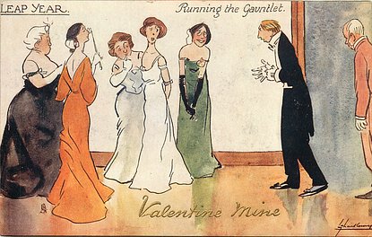 this card comes with Tuck number error as 639. man approaches a bevy of five females, comes opt. in gilt VALENTINE MINE or FOND GREETINGS