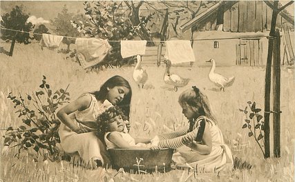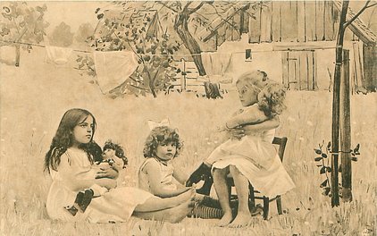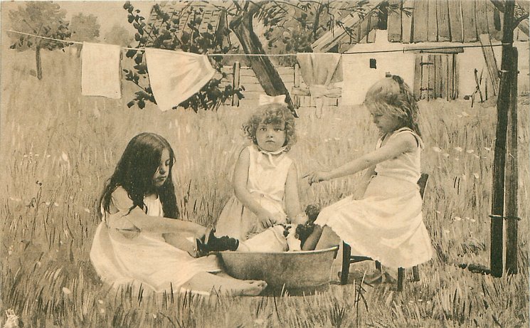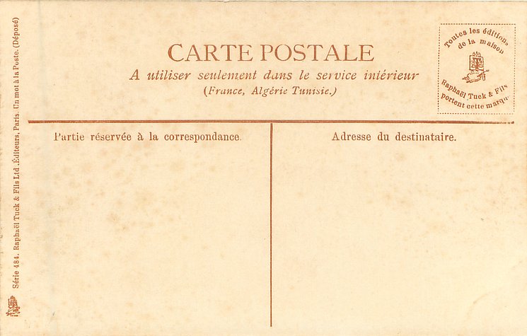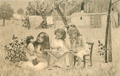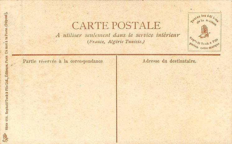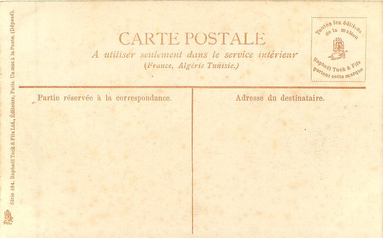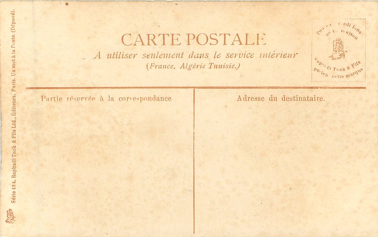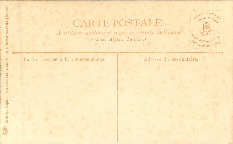 bistre, UN MOT A LA POSTE, (DEPOSE), come OFFERT PAR LA MAISON LAPARRA-PARAPLUIES, PARIS, sepia, same images English backs 6008 girls at play