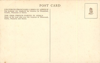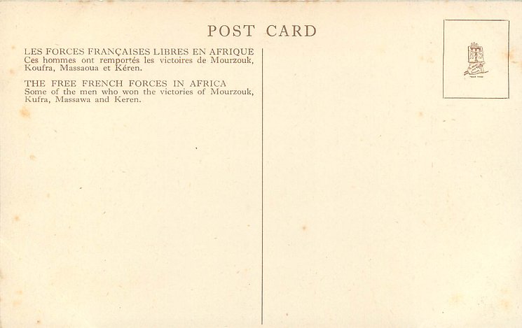 back:- CES HOMMES ONT REMPORTE LES VICTOIRES DE MOURZOUK, KOUFRA, MASSAOUA ET KEREN THE FREE FRENCH FORCES IN AFRICA SOME OF THE MEN WHO WON THE VICTORIES OF MOURZOUK, KOUFRA, MASSAOUA AND KEREN