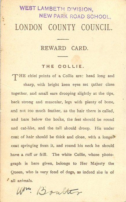 back:- THE COLLIE. THE CHIEF POINTS OF THE COLLIE ARE: HEAD LONG AND SHARP, WITH BRIGHT KEEN EYES SET RATHER CLOSE TOGETHER, AND SMALL EARS DROOPING SLIGHTLY AT THE TIPS//ANIMALS