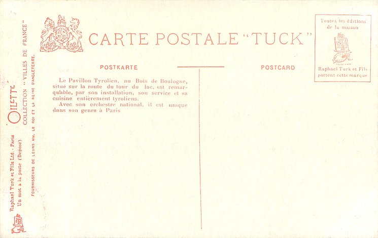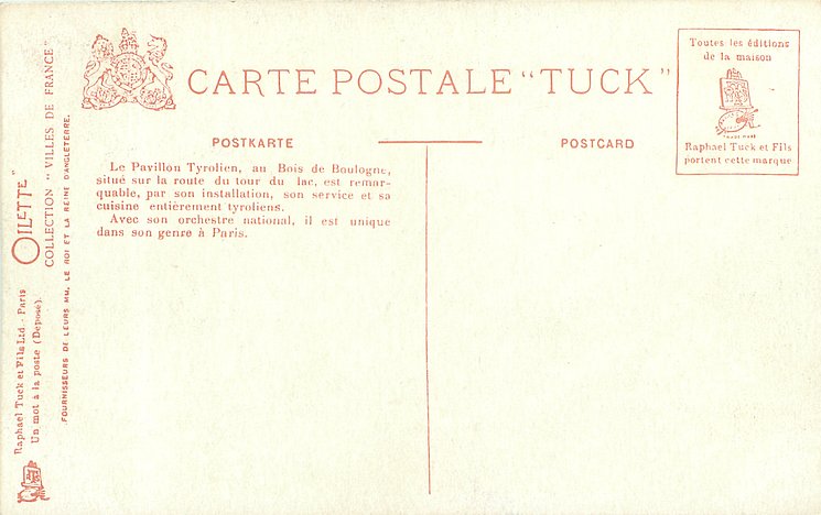 OILETTE, UN MOT A LA POSTE (DEPOSE), 9 of these images are in OILETTE 702 PONTS DE PARIS with inset numbers, come with various red overprints for PARIS OFFICE, SINCLAIR ROONEY, BUFFALO, N.Y. 1905/6, also as a grey version for EXIBARD'S ASTHMA POWDER, LONDON, same images English backs OILETTE WIDE-WIDE-WORLD 7379 & 7380 PARIS BRIDGES I & II